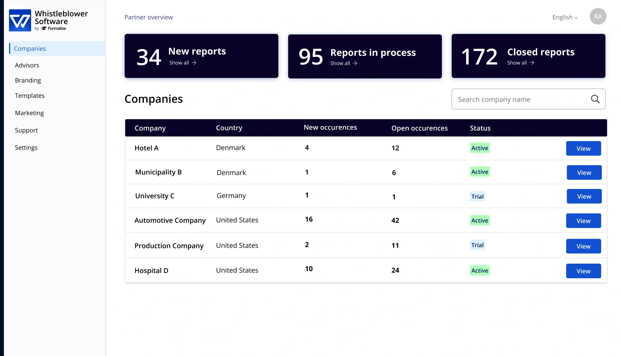 Whistleblower Software by Formalize bietet ein Modul, das die einfache Verwaltung von allen Whistleblower-Kanälen und -Meldungen von Ihren Kunden in einer einzigen Übersicht ermöglicht.